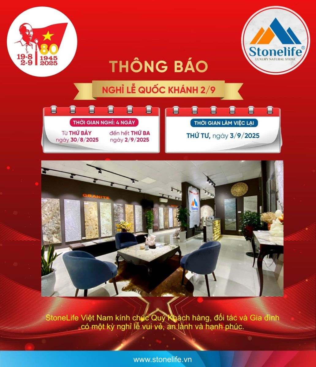 Nhân dịp Quốc khánh 2-9, Công ty Cổ phần StoneLife Việt Nam xin thông báo đến toàn thể Quý Khách hàng về lịch nghỉ lễ như sau: Thời gian nghỉ: Từ ngày 30 tháng 08 đến hết ngày 02 tháng 09 năm 2025 Thời gian làm việc trở lại: Thứ Tư, ngày 03 tháng 09 năm 2025 Trong thời gian nghỉ, các hoạt động kinh doanh và dịch vụ hỗ trợ khách hàng của chúng tôi sẽ tạm ngừng. Chúng tôi rất mong Quý Khách hàng thông cảm cho sự bất tiện này. Để đảm bảo không ảnh hưởng đến công việc và kế hoạch của Quý Khách hàng, xin vui lòng sắp xếp và liên hệ với chúng tôi trước hoặc sau thời gian nghỉ lễ để được hỗ trợ tốt nhất. Nếu cần hỗ trợ gấp trong thời gian nghỉ, vui lòng liên hệ với chúng tôi qua email hoặc hotline để được trợ giúp kịp thời. Chúng tôi xin kính chúc Quý Khách hàng và Gia đình có một kỳ nghỉ lễ vui vẻ, an lành và hạnh phúc. Xin chân thành cảm ơn!